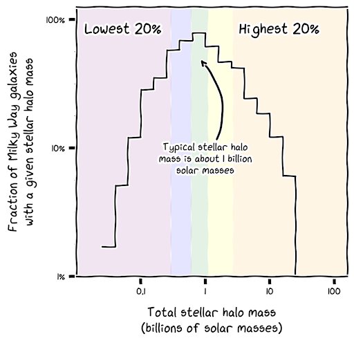 However, we can see there’s a very wide range of possibilities, from 10 times smaller to 10 times larger than the Milky Way stellar halo.
